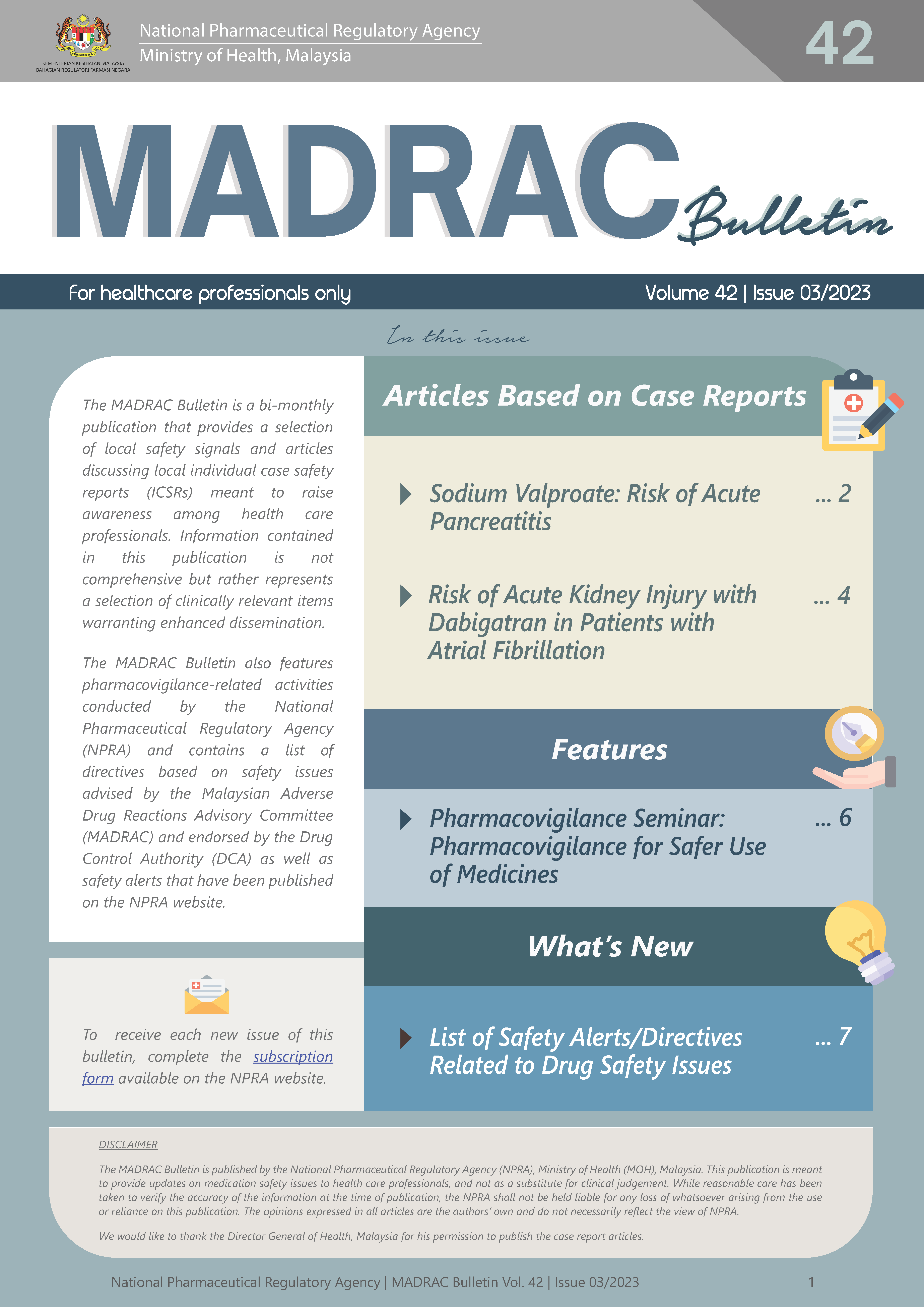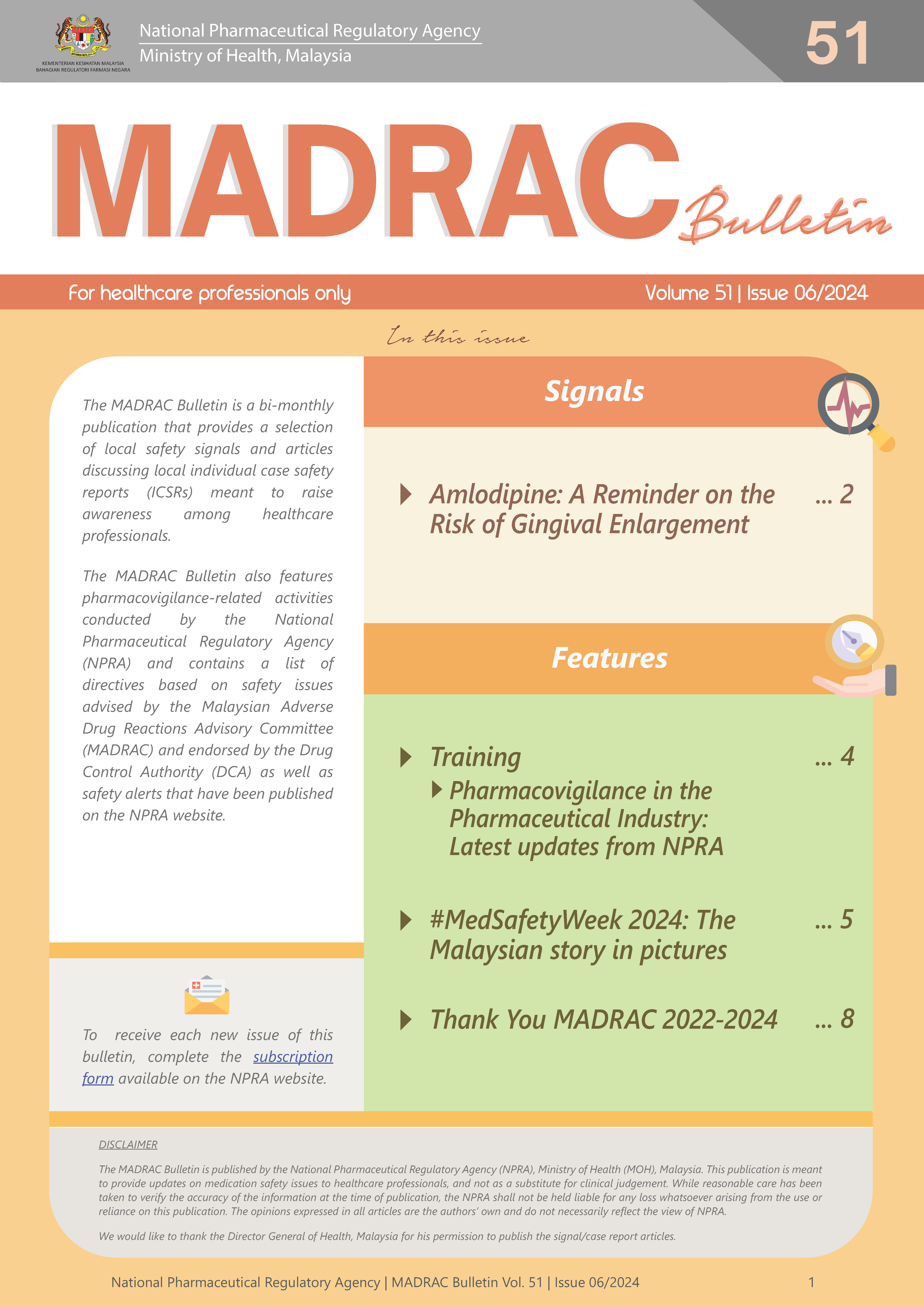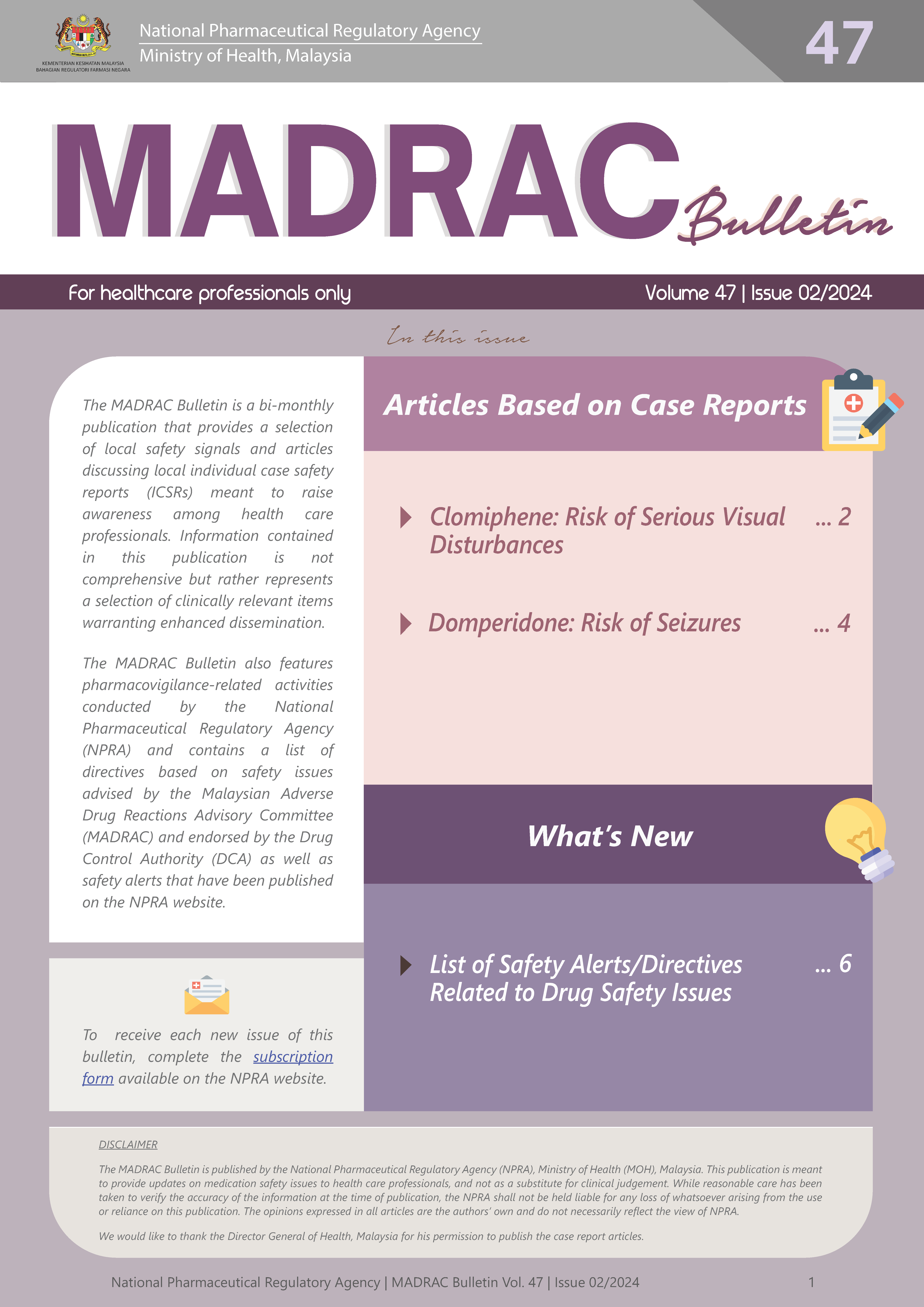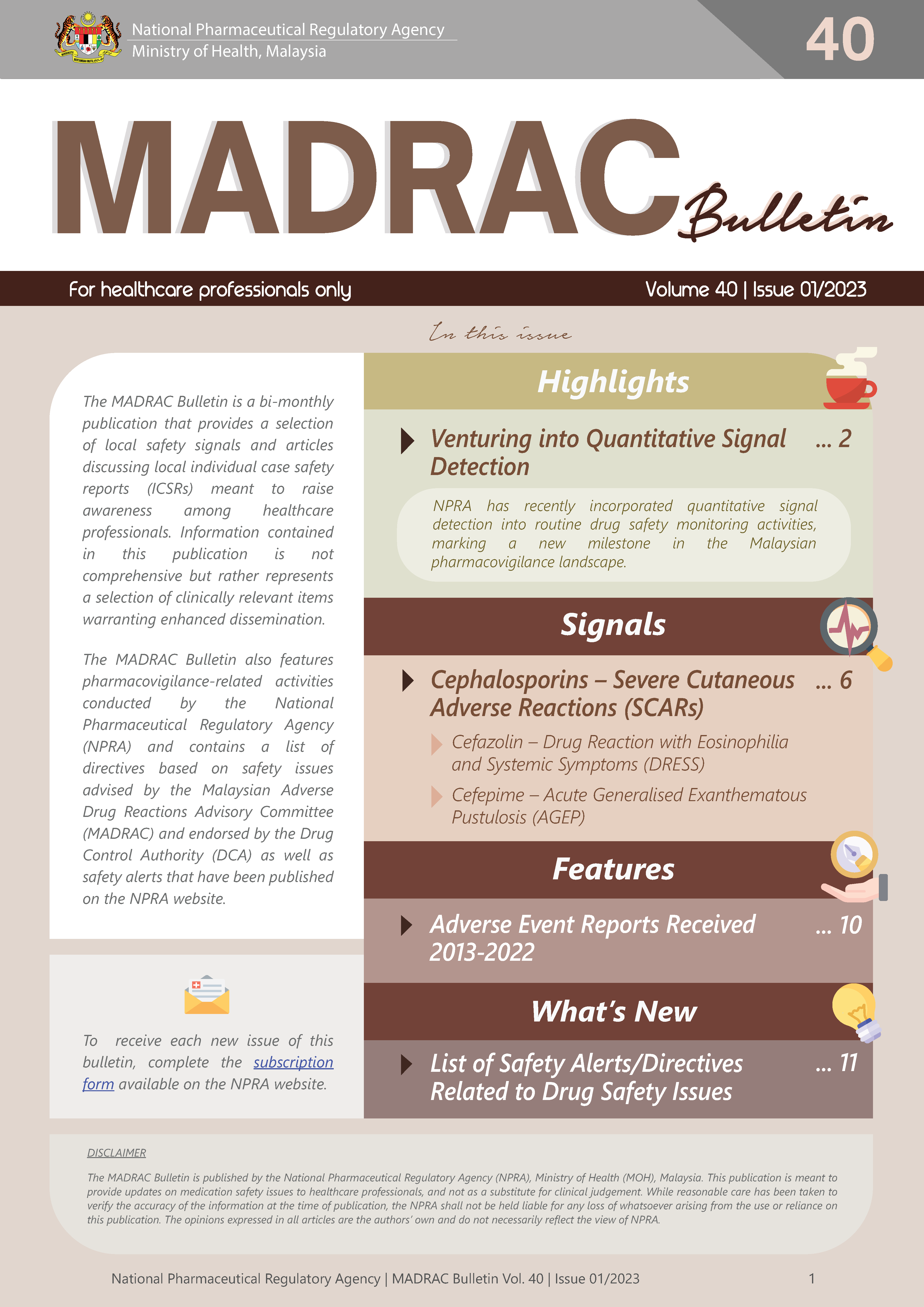 The MADRAC Bulletin also features pharmacovigilance-related activities conducted by the National Pharmaceutical Regulatory Agency (NPRA) and contains a list of directives based on safety issues advised by the Malaysian Adverse Drug Reactions Advisory Committee (MADRAC) and endorsed by the Drug Control Authority (DCA) as well as safety alerts that have been published on the NPRA website.
