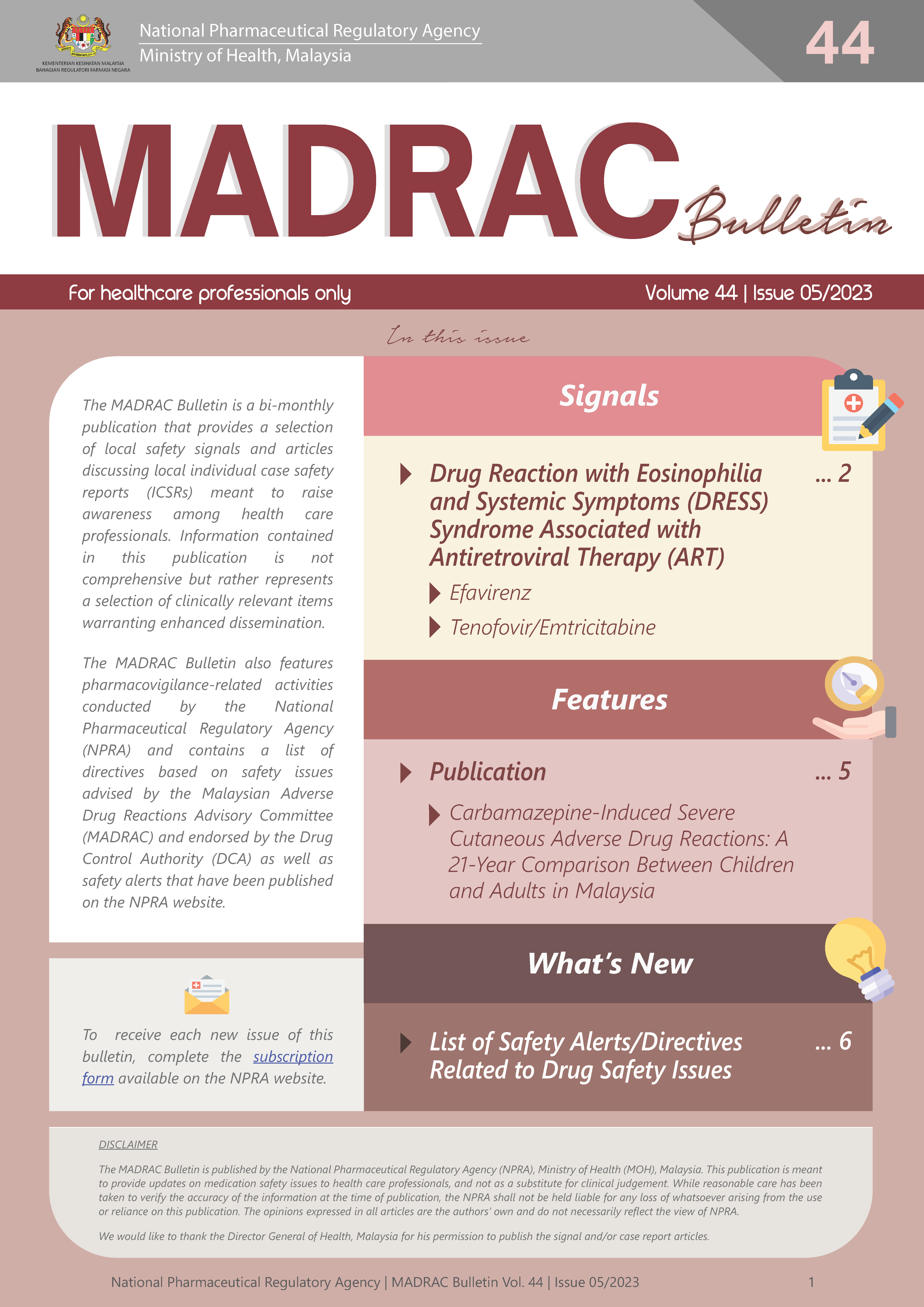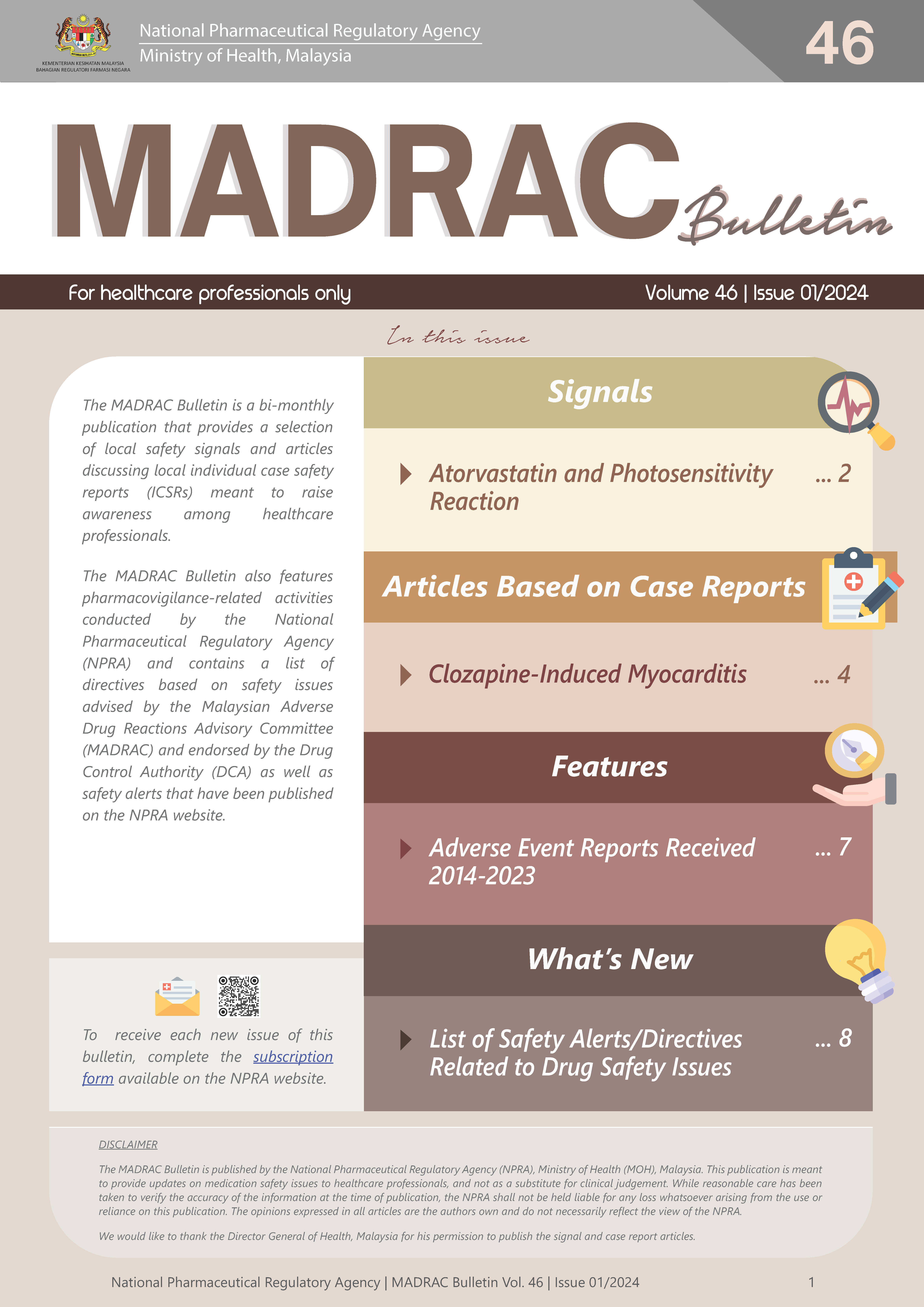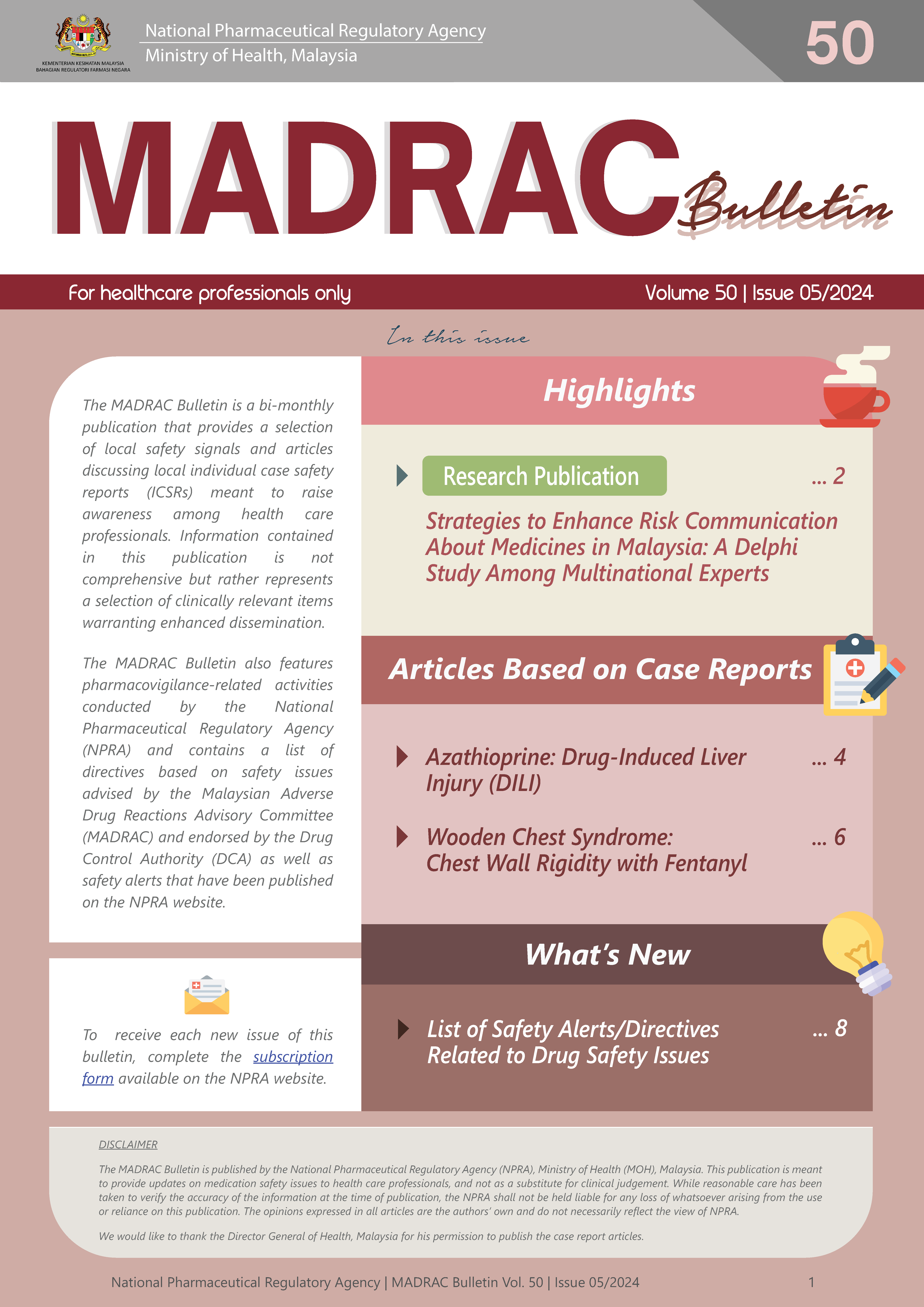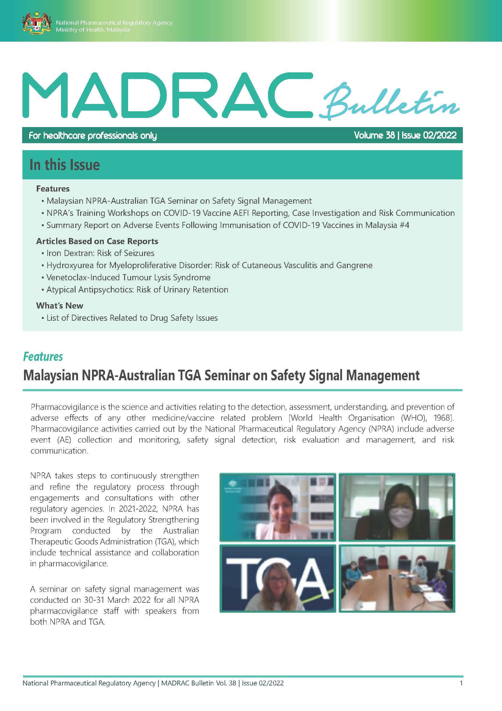 The MADRAC Bulletin also features pharmacovigilance-related activities conducted by the National Pharmaceutical Regulatory Agency (NPRA) and contains a list of directives based on safety issues advised by the Malaysian Adverse Drug Reactions Advisory Committee (MADRAC) and endorsed by the Drug Control Authority (DCA) as well as safety alerts that have been published on the NPRA website.