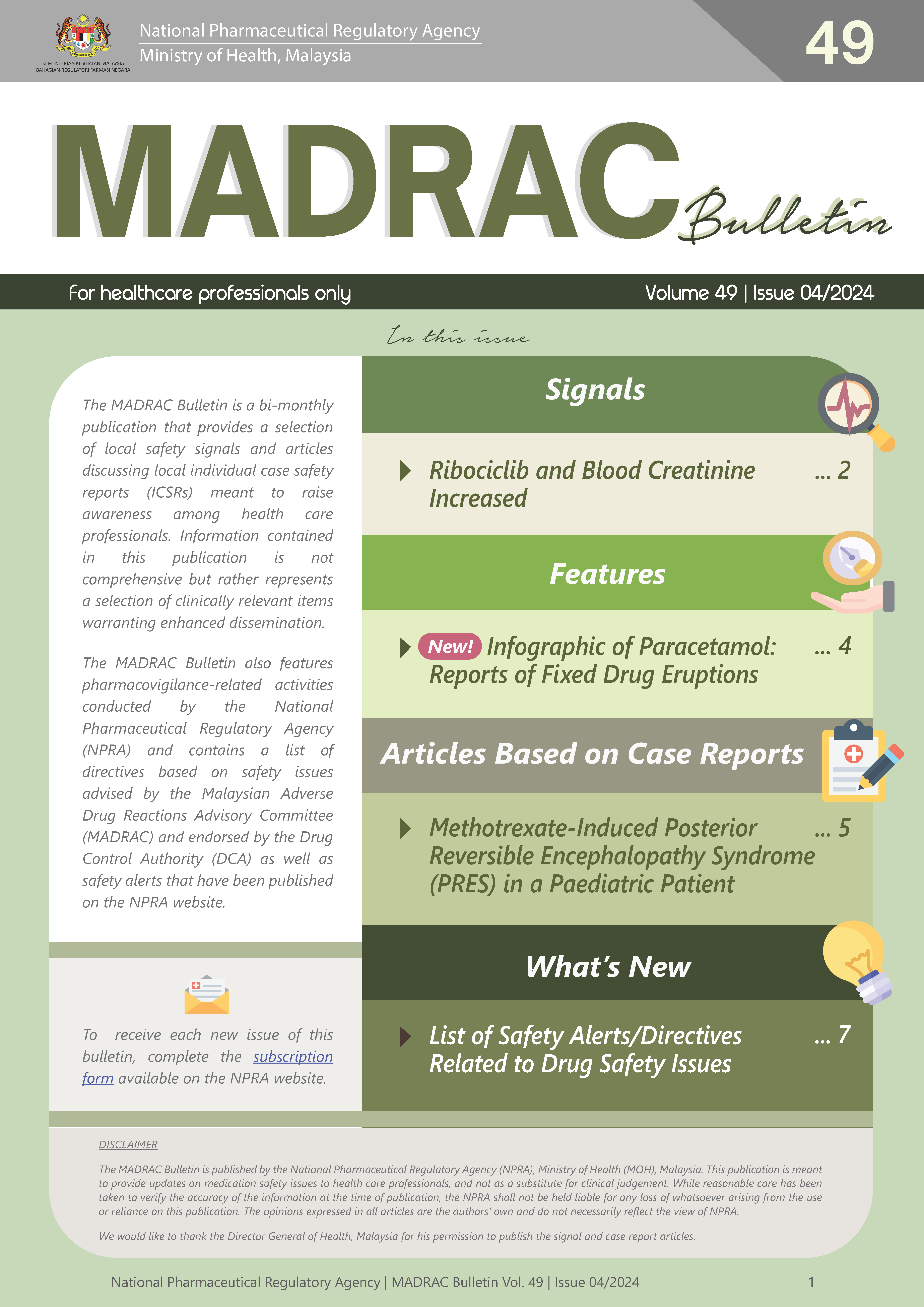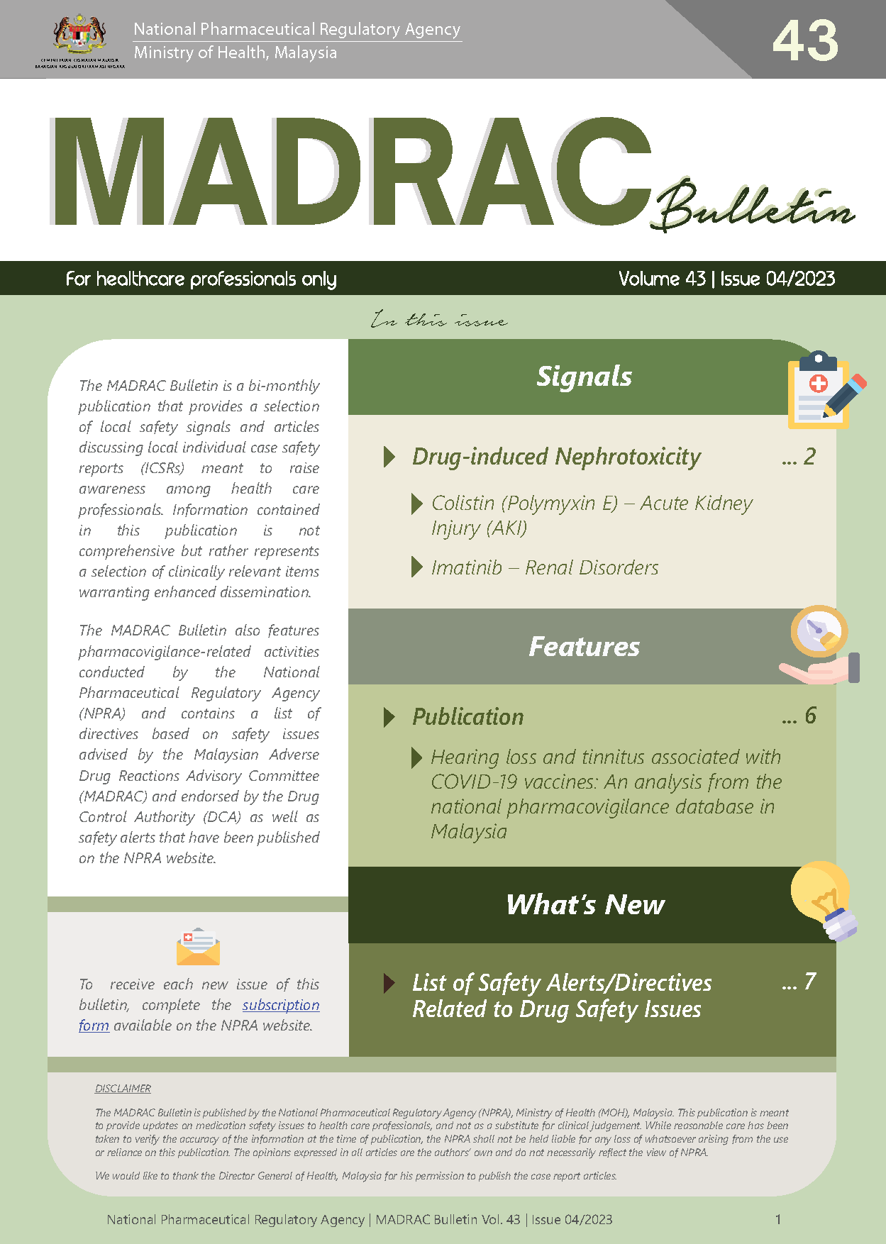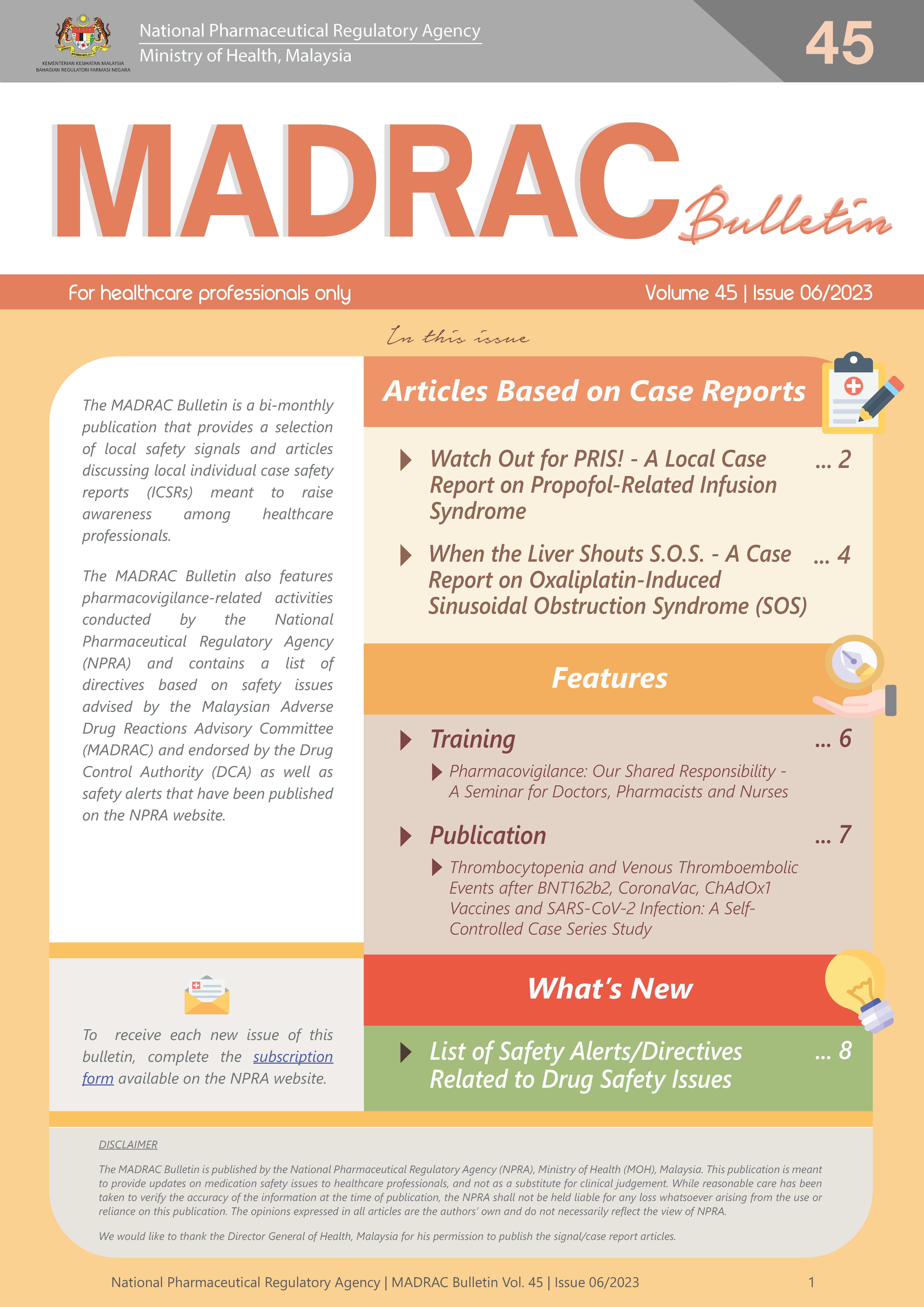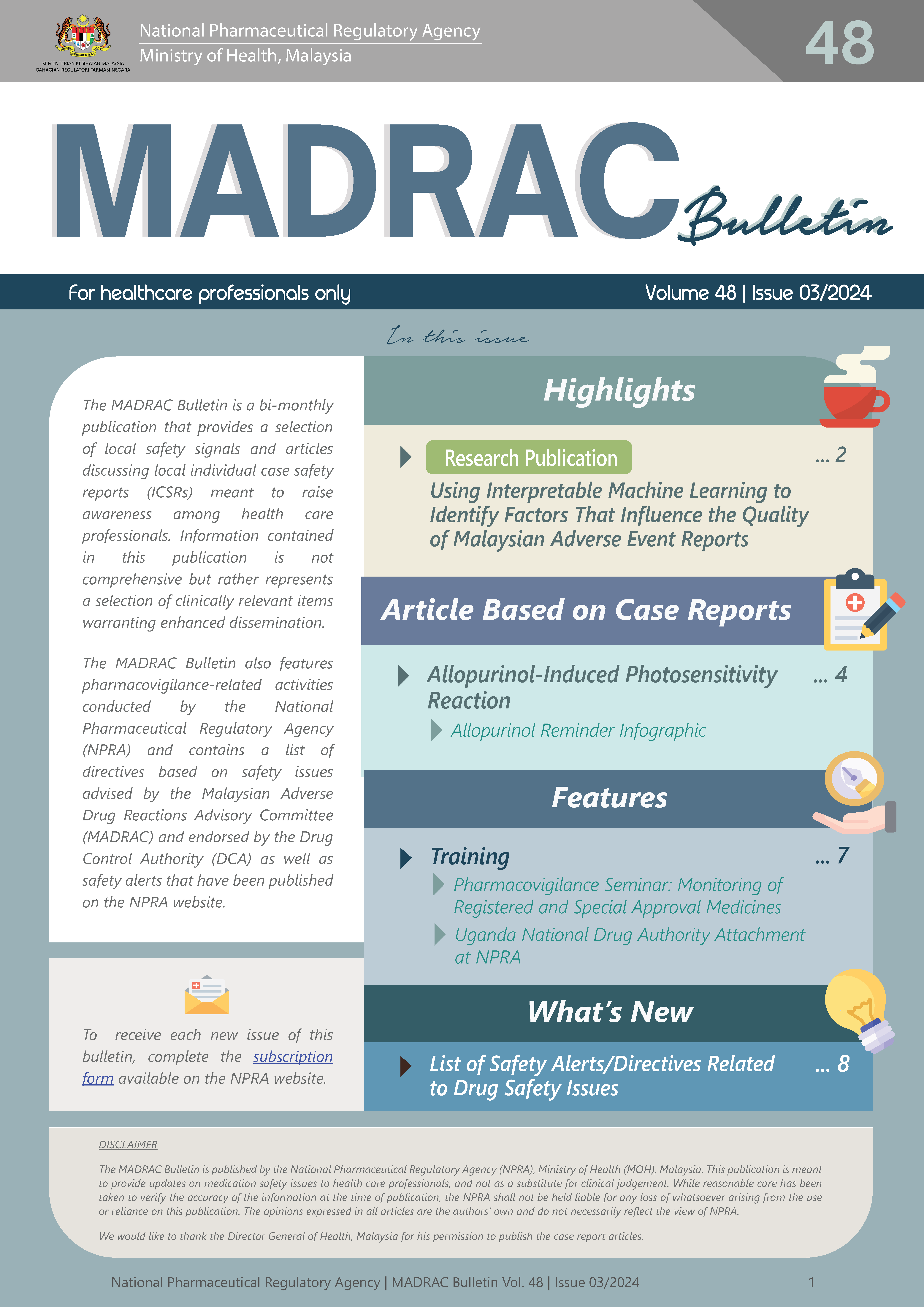 The MADRAC Bulletin also features pharmacovigilance-related activities conducted by the National Pharmaceutical Regulatory Agency (NPRA) and contains a list of directives based on safety issues advised by the Malaysian Adverse Drug Reactions Advisory Committee (MADRAC) and endorsed by the Drug Control Authority (DCA) as well as safety alerts that have been published on the NPRA website.