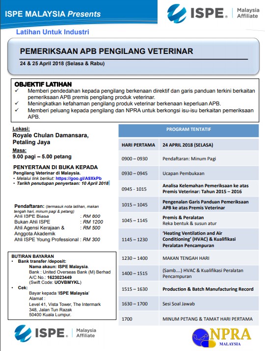Pemeriksaan Apb Pengilang Veterinar 24 & 25 April 2018 (Selasa & Rabu) Objectives 1. Memberi pendedahan kepada pengilang berkenaan direktif dan garis panduan terkini berkaitan pemeriksaan APB premis pengilang produk veterinar. 2. Meningkatkan kefahaman pengilang produk veterinar berkenaan keperluan APB. 3. Memberi peluang kepada pengilang dan NPRA untuk berkongsi isu-isu berkaitan pemeriksaan APB.