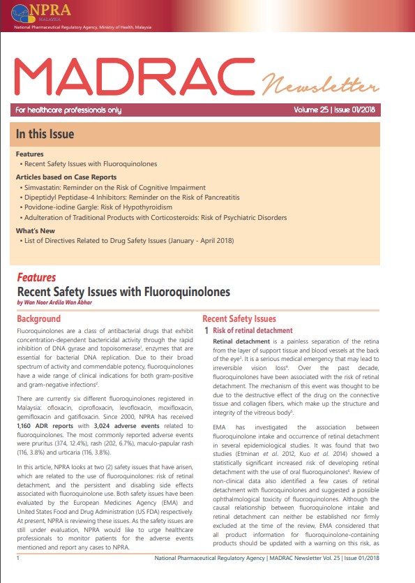 MADRAC Bulletin - Issue 01/2018Features▪ Recent Safety Issues with Fluoroquinolones Articles based on Case Reports ▪ Simvastatin: Reminder on the Risk of Cognitive Impairment What’s New ▪ List of Directives Related to Drug Safety Issues (January - April 2018)