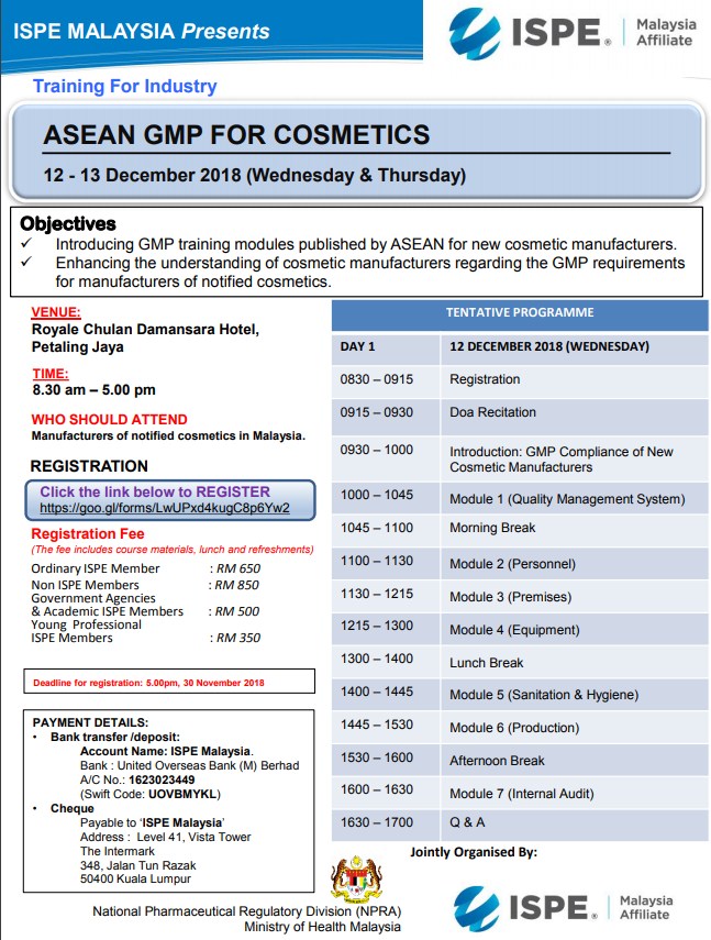 Asean GMP For Cosmetics 12 - 13 December 2018 (Wednesday & Thursday) Objectives 1. Introducing GMP training modules published by ASEAN for new cosmetic manufacturers. 2. Enhancing the understanding of cosmetic manufacturers regarding the GMP requirements for manufacturers of notified cosmetics.
