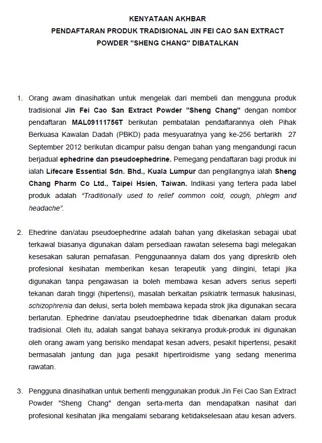 Press Release : Jin Fei Cao San Extract Powder "Sheng Chang" Cancelled