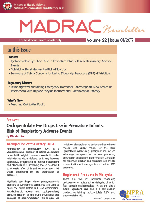 MADRAC Bulletin - Issue 01/2017Features▪ Cyclopentolate Eye Drops Use in Premature Infants: Risk of Respiratory Adverse Events▪ Colchicine: Reminder on the Risk of Toxicity Regulatory Matters▪ Levonorgestrel-containing Emergency Hormonal Contraception: New Advice on What’s New▪ Reaching Out to the Public |
