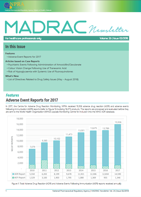 ▪ Laporan Kesan Advers untuk Tahun 2017 Artikel berdasarkan Laporan Kes ▪ Psychiatric Events Following Administration of Amoxicillin/Clavulanate ▪ Colour Vision Change Following Use of Tranexamic Acid ▪ Risk of Hypoglycaemia with Systemic Use of Fluoroquinolones Terkini ▪ List of Directives Related to Drug Safety Issues (May - August 2018)