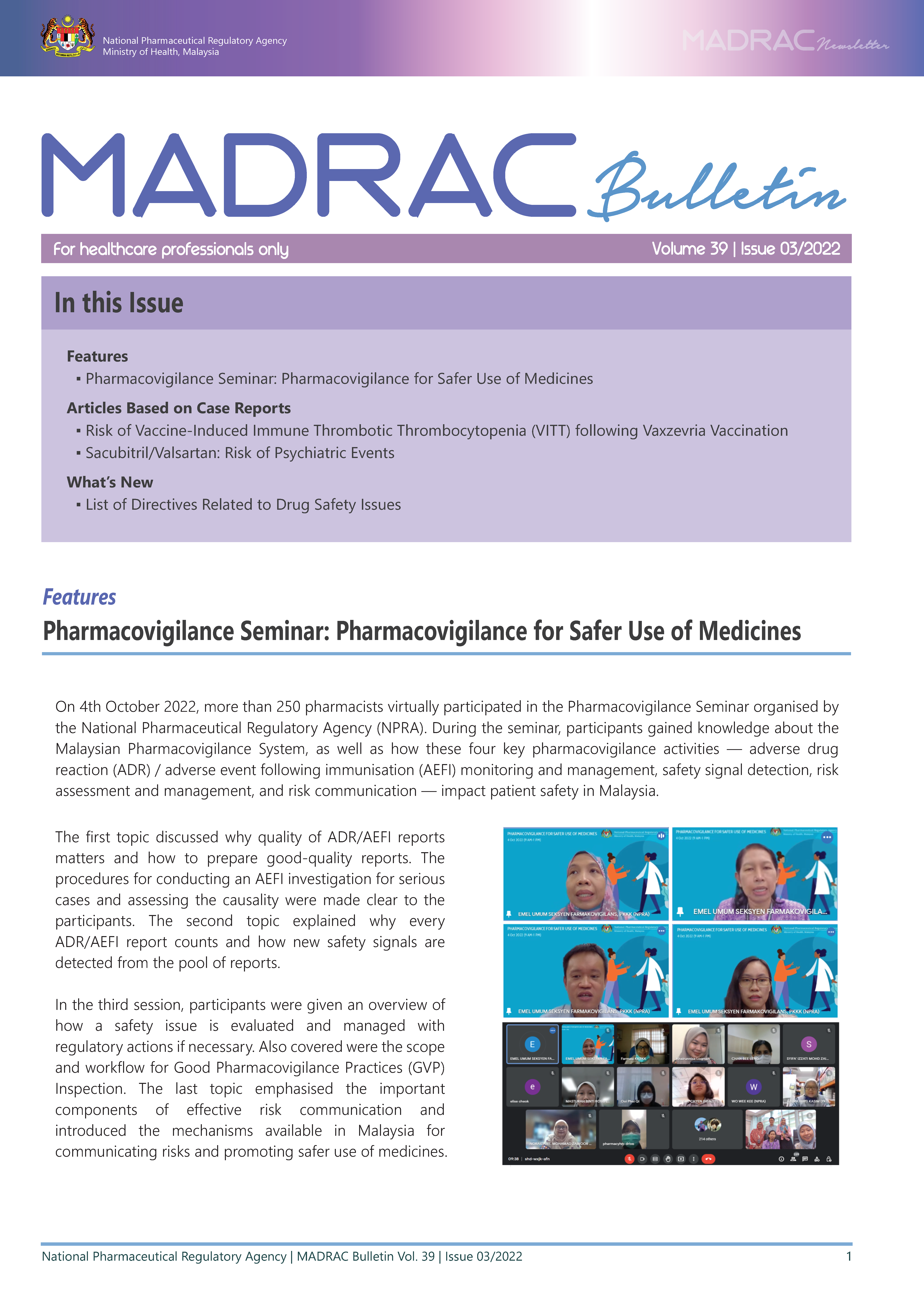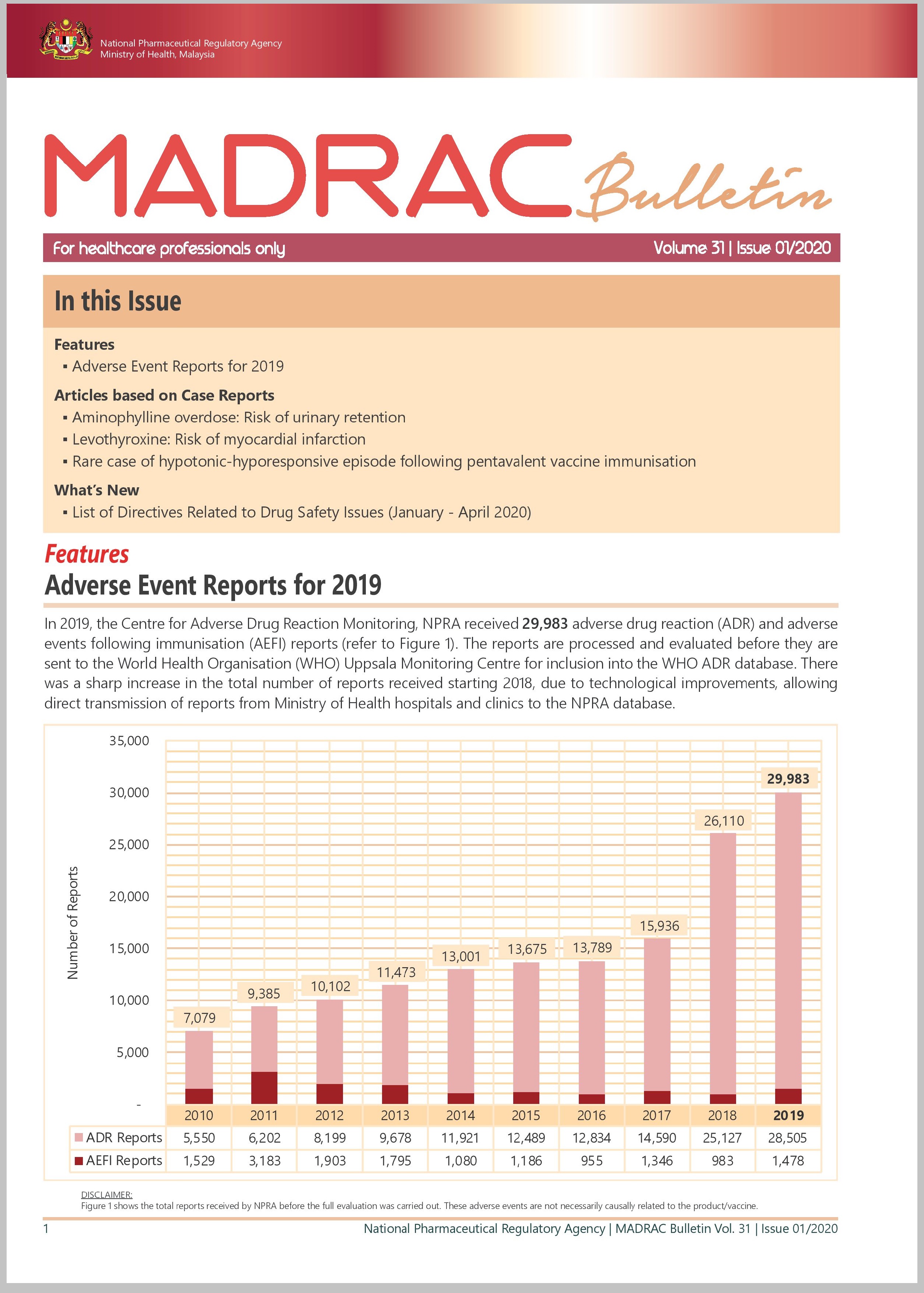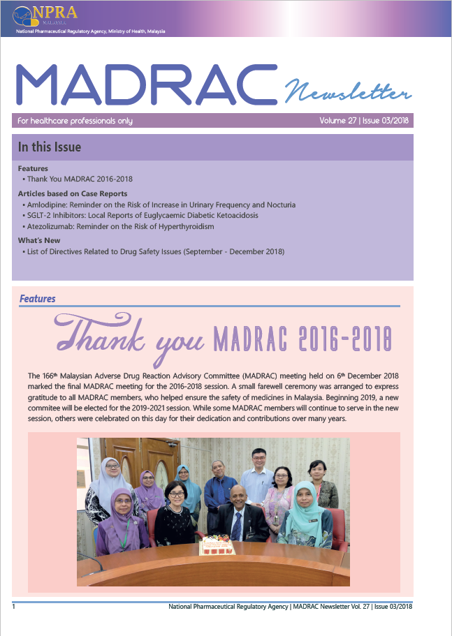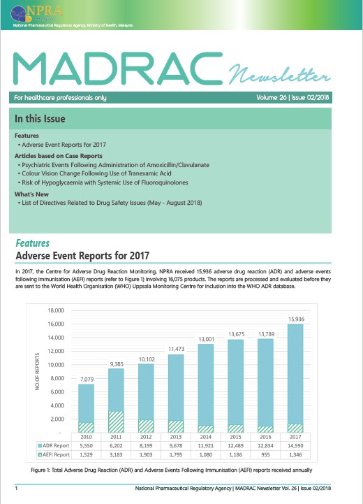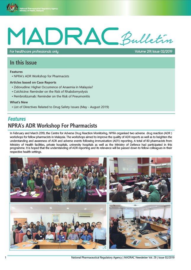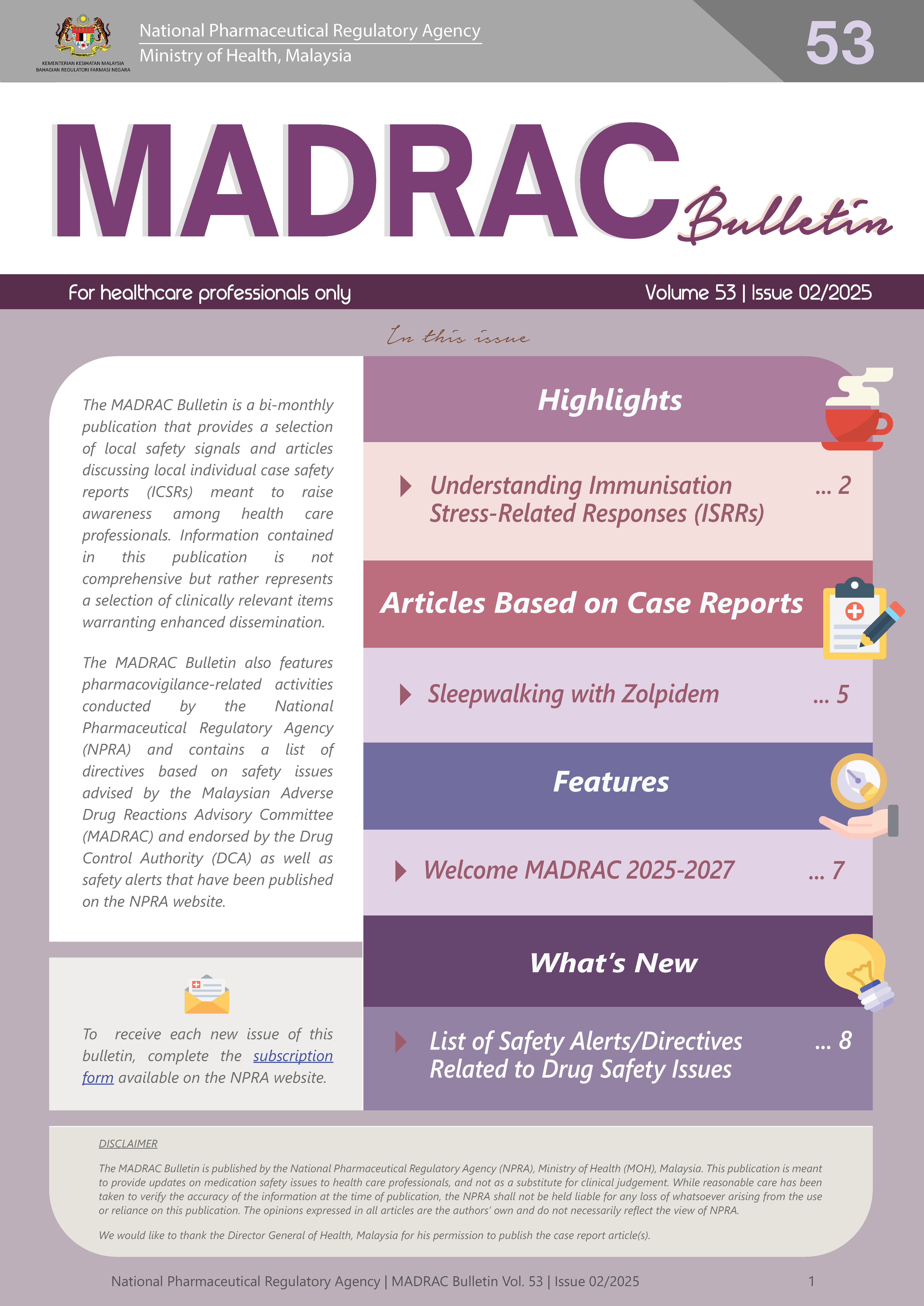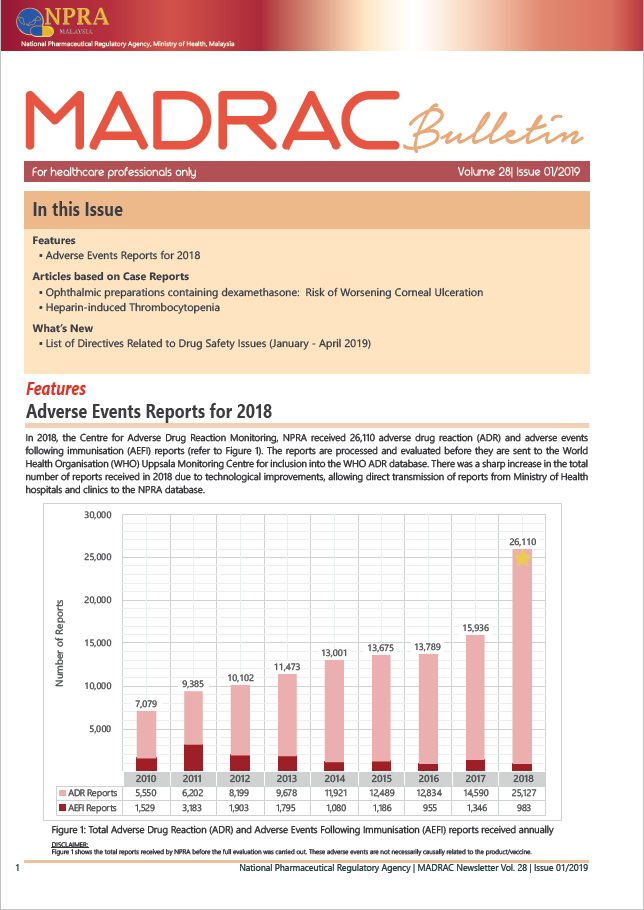The MADRAC Bulletin also features pharmacovigilance-related activities conducted by the National Pharmaceutical Regulatory Agency (NPRA) and contains a list of directives based on safety issues advised by the Malaysian Adverse Drug Reactions Advisory Committee (MADRAC) and endorsed by the Drug Control Authority (DCA) as well as safety alerts that have been published on the NPRA website.