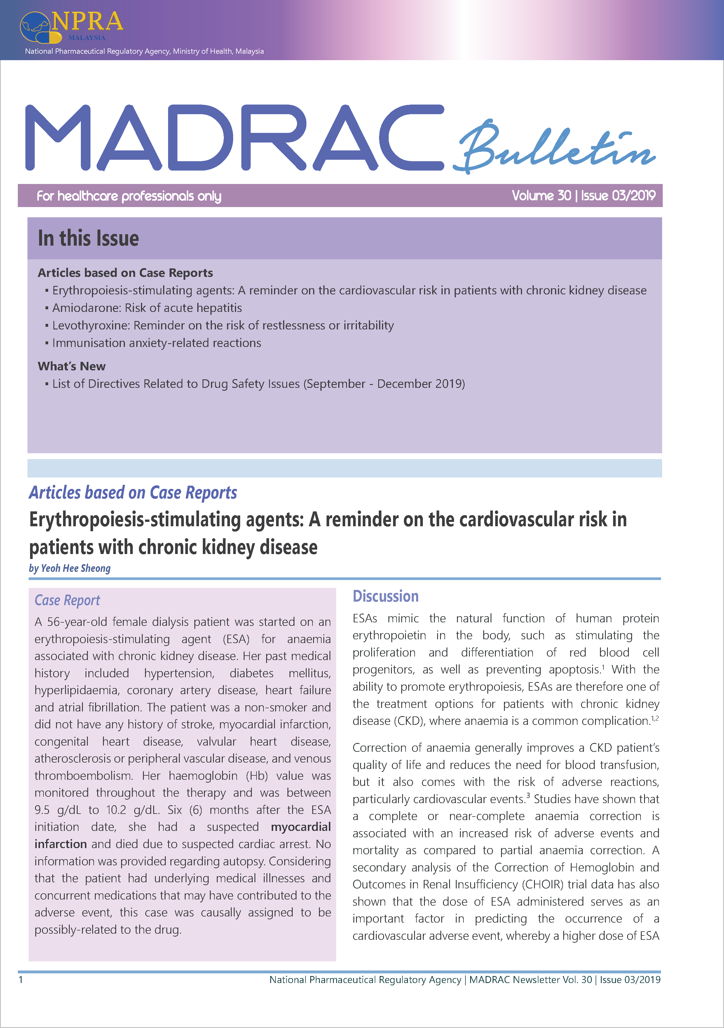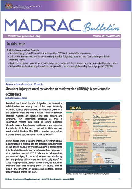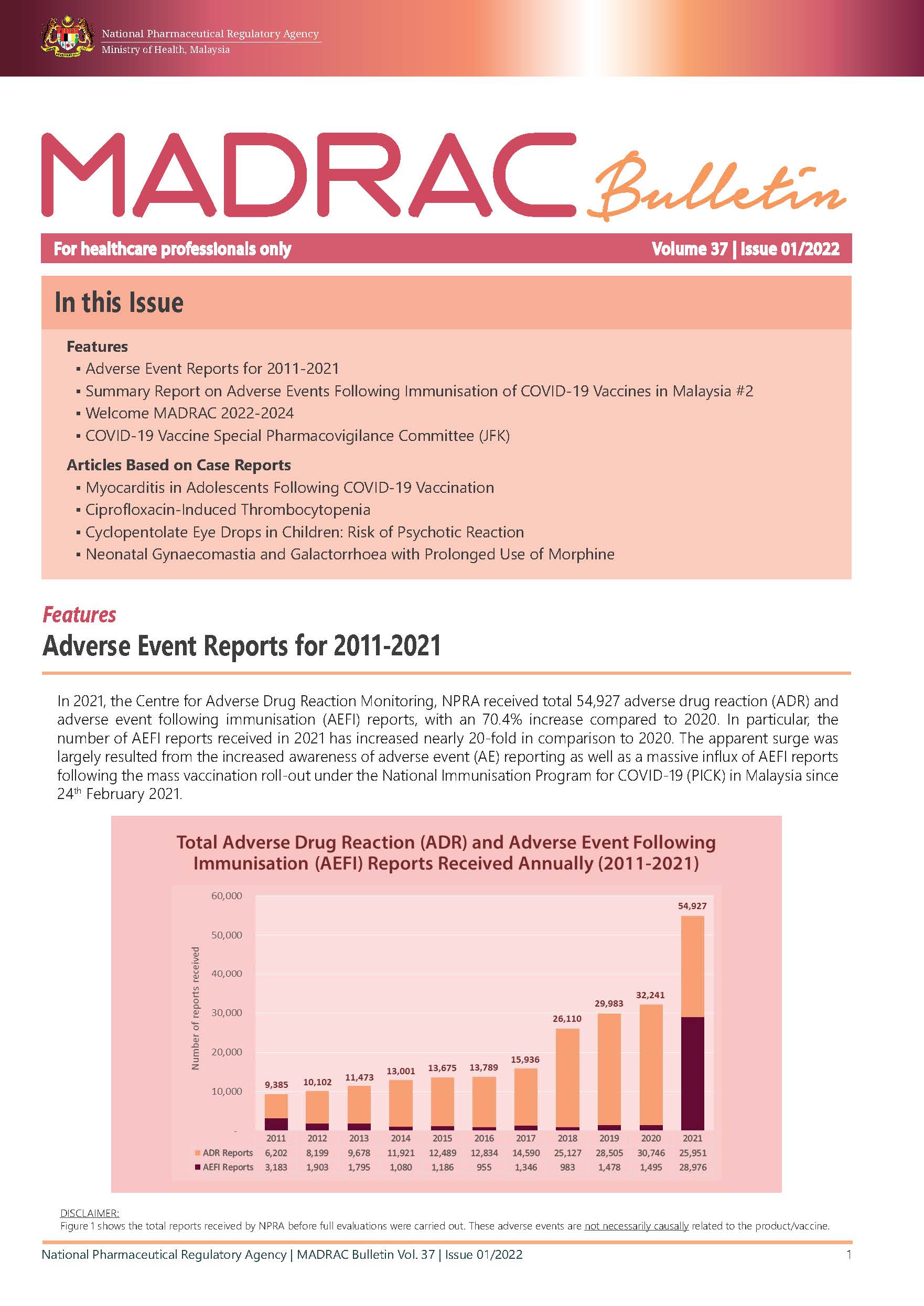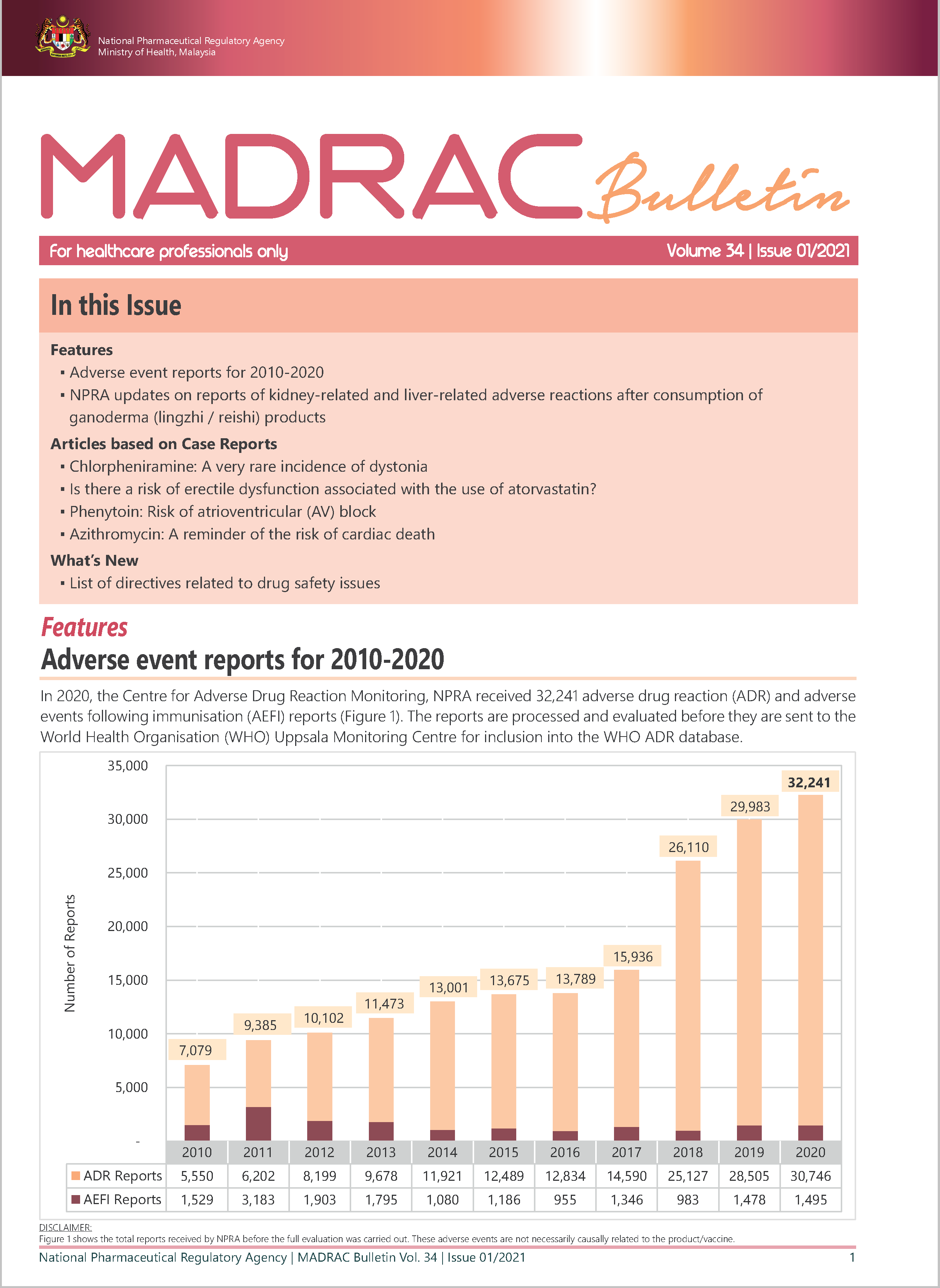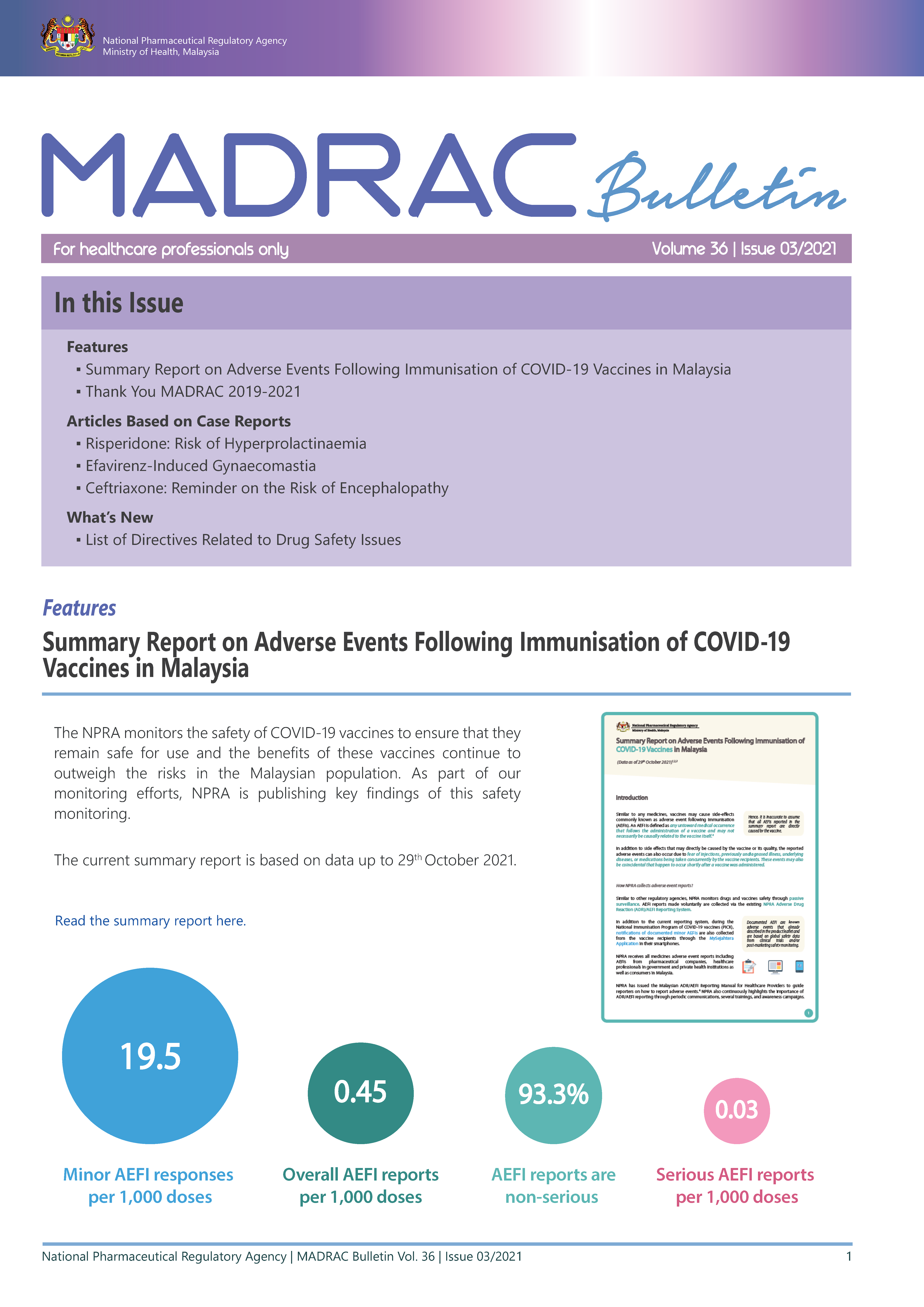 The MADRAC Bulletin also features pharmacovigilance-related activities conducted by the National Pharmaceutical Regulatory Agency (NPRA) and contains a list of directives based on safety issues advised by the Malaysian Adverse Drug Reactions Advisory Committee (MADRAC) and endorsed by the Drug Control Authority (DCA) as well as safety alerts that have been published on the NPRA website.