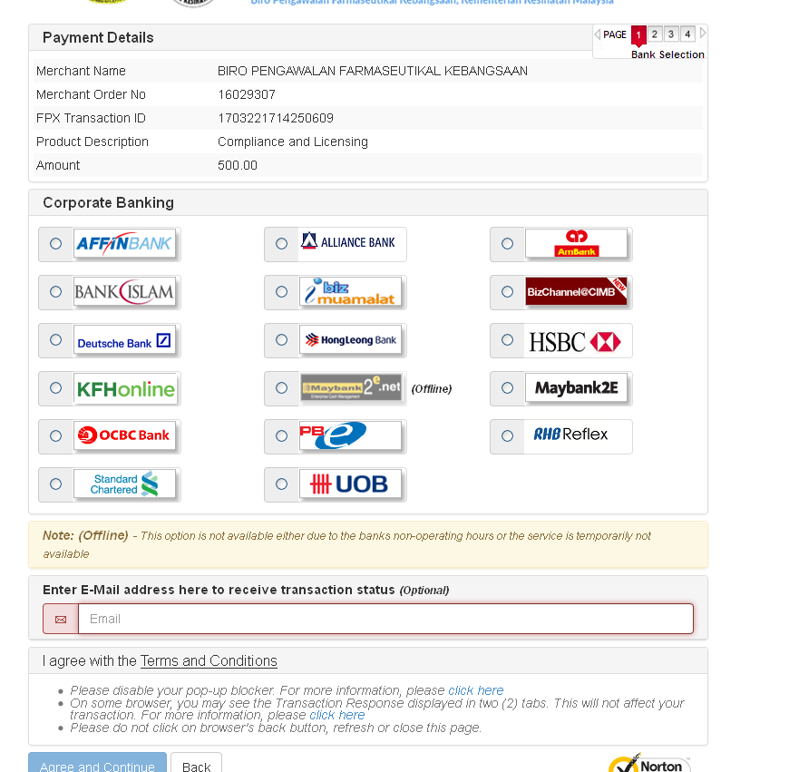 Step 3: Choose participating bank, i.e. Standard Chartered, put in email address and click agree and continue