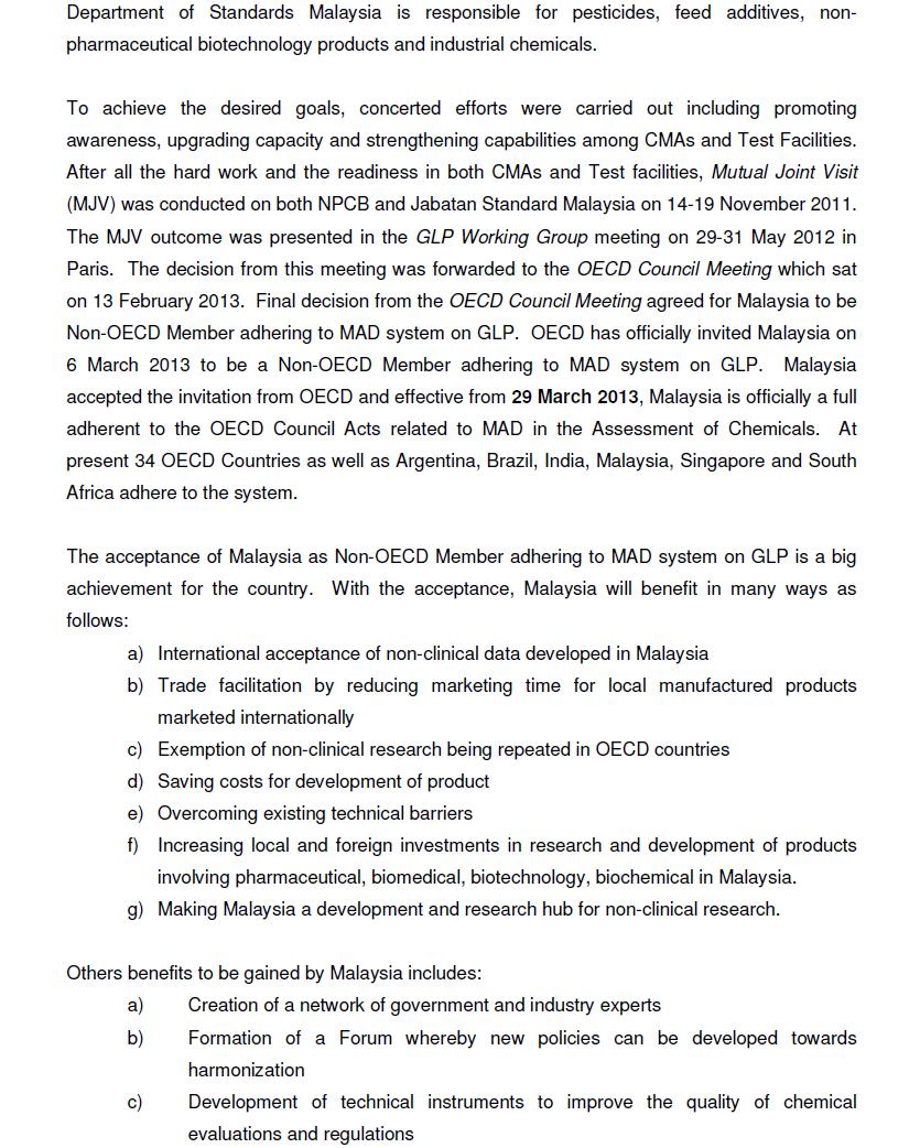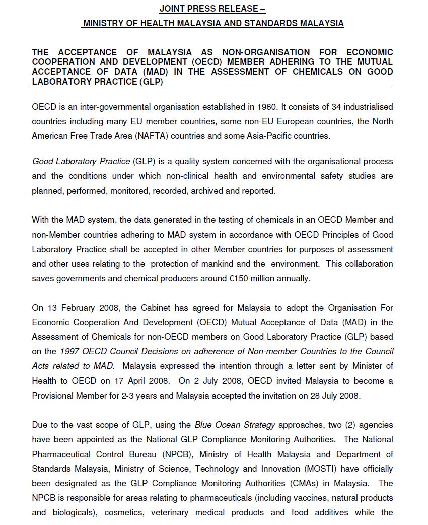 Joint Press Release - MOH Malaysia & Standards Malaysia : The Acceptance of Malaysia as Non-OECD Member Adhering to the MAD In the Assessment of Chemicals on GLP