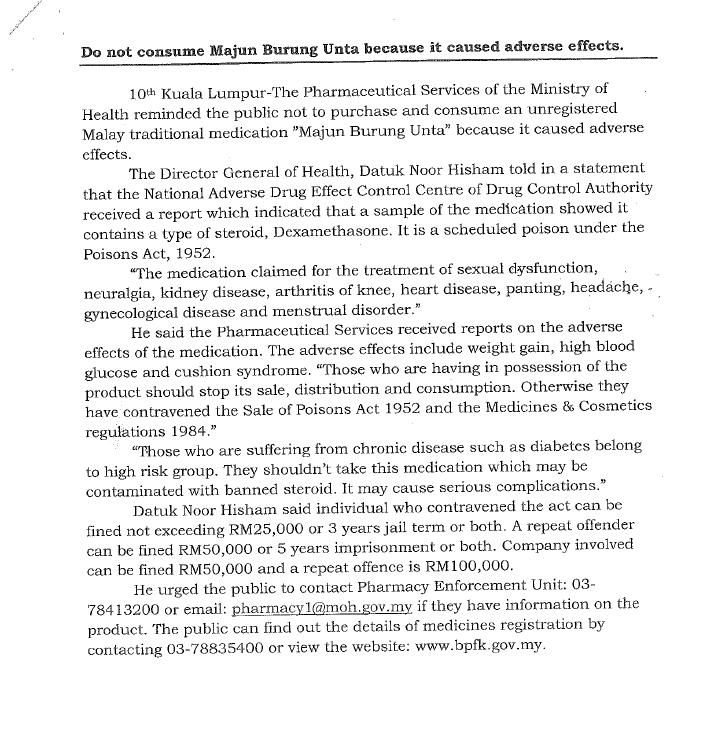 The Government of Malaysia and the National Pharmaceutical Regulatory Agency are not responsible for any loss or damage caused by the usage of any information obtained from this website.