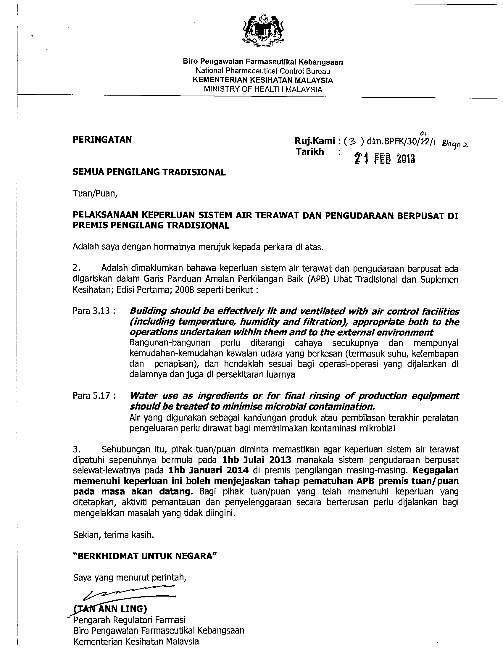 Pelaksanaan Keperluan Sistem Air Terawat dan Pengudaraan Berpusat di Premis Pengilang Tradisional