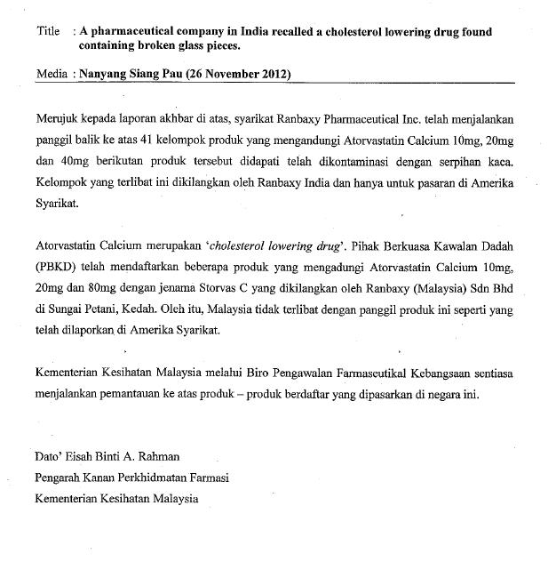 Ulasan Laporan Akhbar : A Pharmaceutical Company in India Recalled A Cholesterol-Lowering Drug Found Containing Broken Glass Pieces