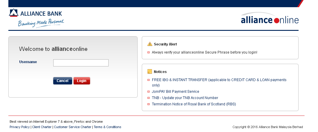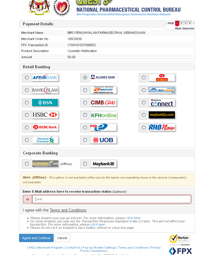 Step 3: Choose participating bank, i.e. Alliance Bank, put in email address and click agree and continue