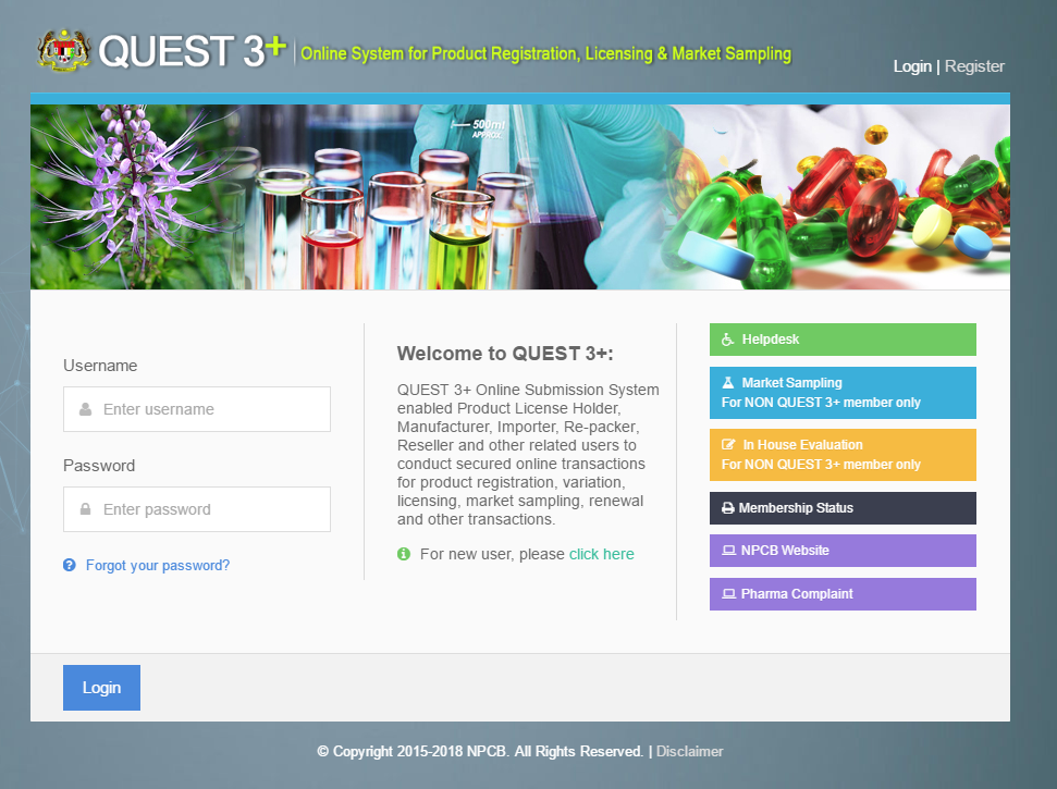 URL sistem aplikasi QUEST3+: https://quest3plus.bpfk.gov.my/. Sila akses QUEST3+ dengan pelayar internet Mozilla Firefox versi 45 dan ke atas ATAU Internet Explorer 10 atau 11.