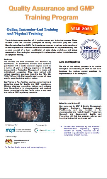 The training program consists of 12 on-line courses and 3 physical courses. These courses cover the essential principles of Quality Assurance (QA) and Good Manufacturing Practice (GMP). Participants are expected to gain an understanding of current requirements and future international trends within the regulated industry. The courses consist of a lively combination of case study workshops and group presentation. The training has been adapted for delivery in an online, virtual classroom and physical training. Aims & Objectives : The aim of the training program is to provide conceptual understanding of GMP, as well as to introduce the various current practices for implementation at the workplace. Who Should Attend Key personnel in GMP & Quality Management, Managers, Engineers, Executives, Quality Practitioners, and any member of the pharmaceutical and related industry. Those from Research and Development, Quality and Production will find this program relevant and beneficial to their job function as well.