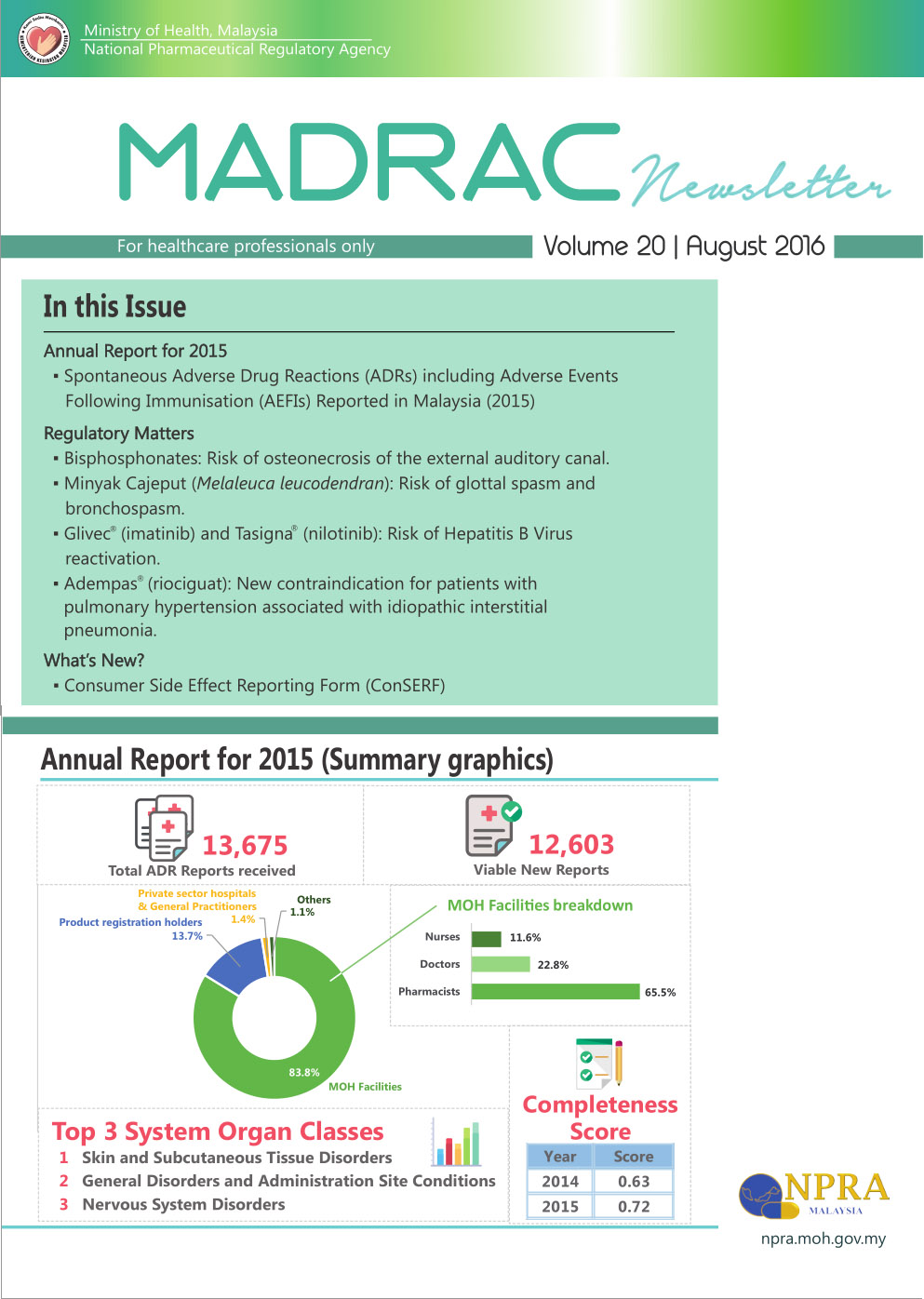MADRAC Bulletin - August 2016Annual Report for 2015▪ Spontaneous Adverse Drug Reactions (ADRs) including Adverse Events Following Immunisation (AEFIs) Reported in Malaysia Regulatory Matters ▪ Bisphosphonates: Risk of osteonecrosis of the external auditory canal. ▪ Minyak Cajeput (Melaleuca leucodendran): Risk of glottal spasm and bronchospasm. ▪ Glivec (imatinib) and Tasigna (nilotinib): Risk of Hepatitis B Virus reactivation. ▪ Adempas (riociguat): New contraindication for patients with pulmonary hypertension associated with idiopathic interstitial pneumonia. What’s New? ▪ Consumer Side Effect Reporting Form (ConSERF)