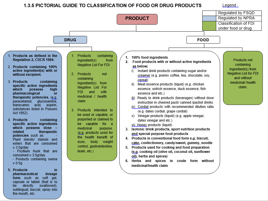 This guide serves to assist in determining if a product is to be regulated by the National Pharmaceutical Regulatory Division (NPRA) or by the Food Safety and Quality Division (FSQD) of the Ministry of Health Malaysia.