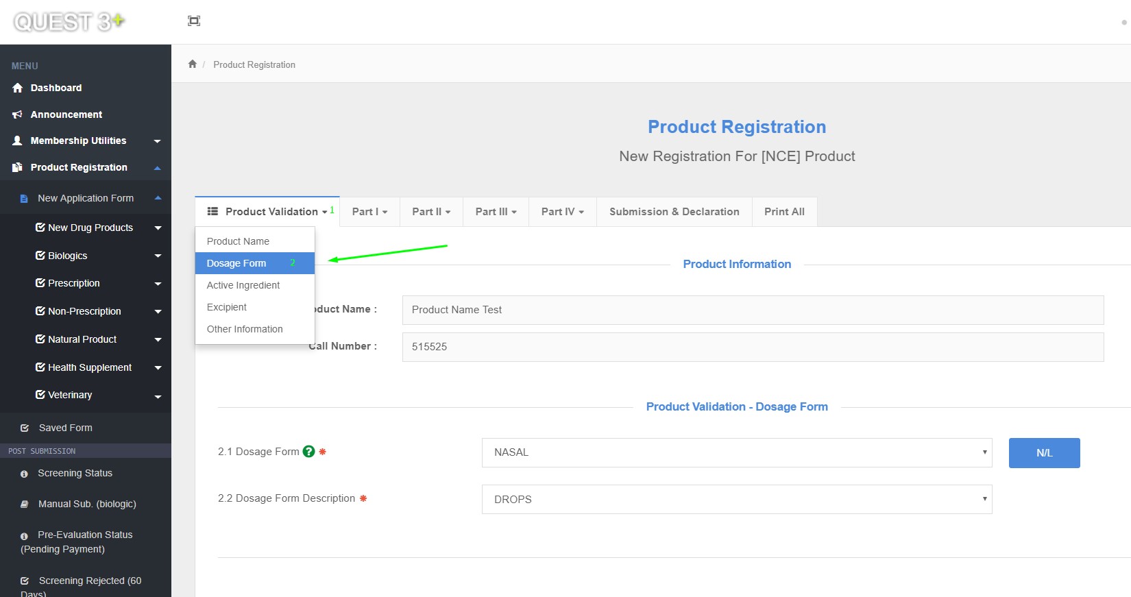 Product Registration >> New Application Form >> Product Validation >> Dosage Form