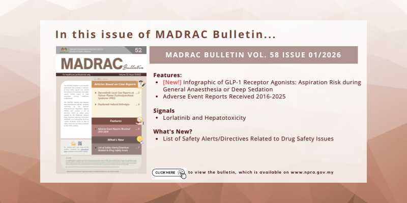 Among the pharmacovigilance activities carried out by NPRA are adverse drug reaction (ADR) monitoring and screening of drug safety alerts. These activities allow identification of drug safety issues, which are reviewed in order to implement preventative measures. NPRA also communicates information on drug safety issues to healthcare professionals and the public, in our ongoing effort increase patient safety.